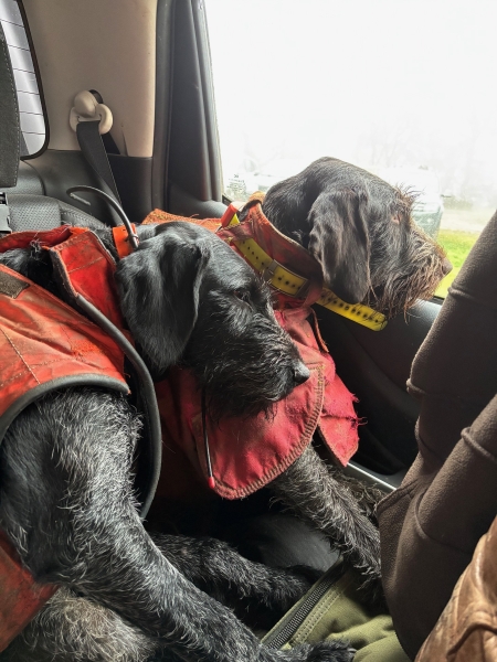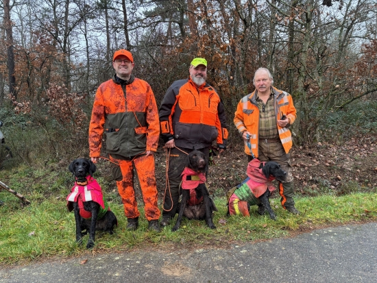 Rike und Ricco (5 Monate) mit Mutter Lissi bei ihrer ersten Drückjagd